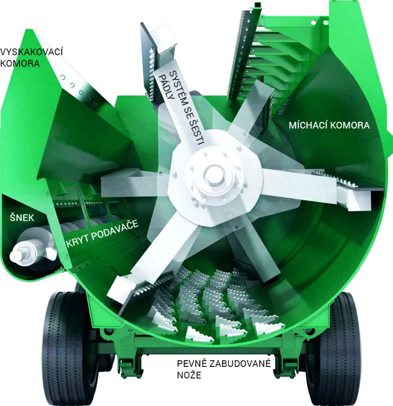 - Pádla jemně zvedají a přehazují vložený materiál přes nože. Krmivo je šetrně sekáno na optimální délku, aniž by byla poškozena kvalita vlákna. Tímto způsobem vznikne směs se správnou délkou a strukturou řezu pro optimální zdraví bachoru.